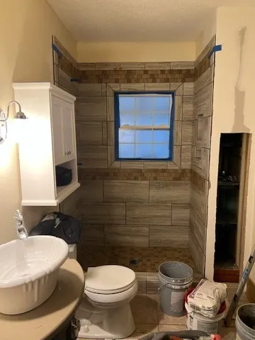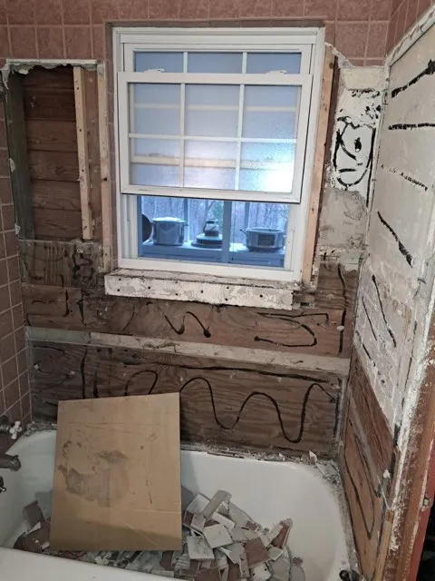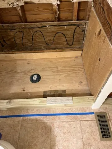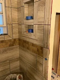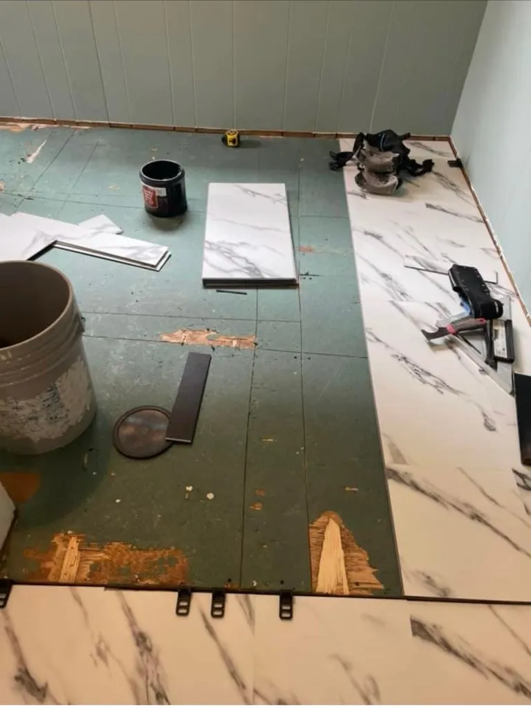 Shaw Floors tile with a dark, burned wood look, in a bathroom
