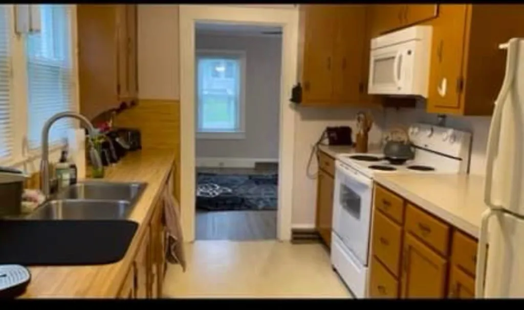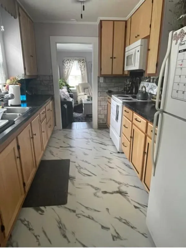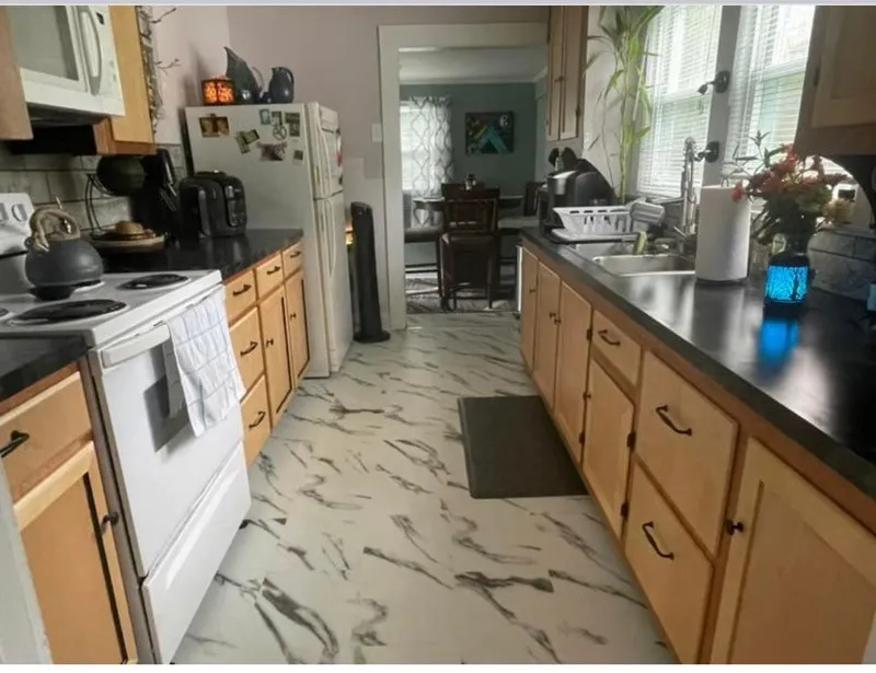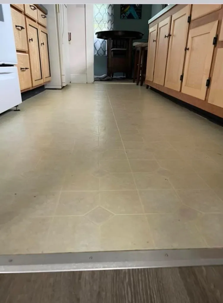 Shaw Floors Beige polished tile with subtle veining in a white kitchen